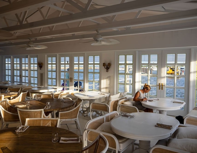 A stunning white seafront restaurant and bar with a chic beach resort-inspired interior and wraparound views