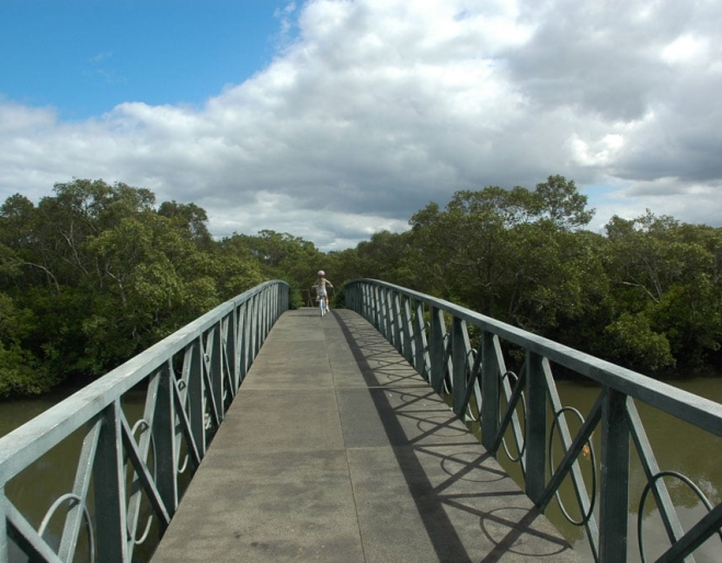 A delightful green belt ride of about 9km skirting Bulimba Creek, this one starts in the back streets of Carindale, passing by the shopping mall and culminating at the spectacular Minnippi Parklands, which those with energy still to burn can circumnavigate before returning. Mostly flat except for the odd gentle slope, this is another well shaded ride along a wide concrete path that passes through scenic wooded glades, meadows, quaint wooden bridges and with an excellent playground as a halfway reward. The parklands themselves are an oasis of lotus covered lagoons, bird watching platforms, windy paths, picnic amenities and a quirky aerodrome themed playground.